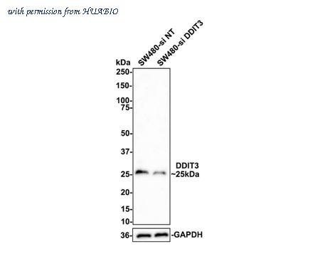 Western blot analysis of DDIT3 on different lysates with Rabbit anti-DDIT3 antibody (HA750369) at 1/1,000 dilution. Lane 1: SW480-si NT cell lysate Lane 2: SW480-si DDIT3 cell lysate Lysates/proteins at 3 µg/Lane. Predicted band size: 19 kDa Observed band size: 25 kDa Exposure time: 5 minutes; 4-20% SDS-PAGE gel. ET1703-05 was shown to specifically react with DDIT3 in SW480-si NT cells. Weakened band was observed when SW480-si DDIT3 sample was tested. SW480-si NT and SW480-si DDIT3 samples were subjected to SDS-PAGE. Proteins were transferred to a PVDF membrane and blocked with 5% NFDM in TBST for 1 hour at room temperature. The primary antibody (ET1703-05, 1/1,000) and Loading control antibody (Rabbit anti-GAPDH, ET1601-4, 1/10,000) were used in 5% BSA at room temperature for 2 hours. Goat Anti-rabbit IgG-HRP Secondary Antibody (HA1001) at 1:100,000 dilution was used for 1 hour at room temperature.