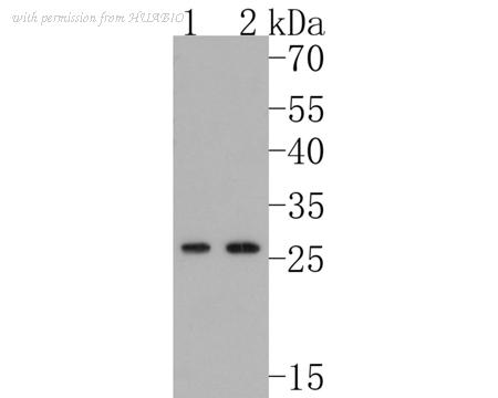 Western blot analysis of DDIT3 on different lysates with Rabbit anti-DDIT3 antibody (HA750369) at 1/5,000 dilution. Lane 1: SW480 cell lysate (20 µg/Lane) Lane 2: HeLa cell lysate (20 µg/Lane) Predicted band size: 19 kDa Observed band size: 27 kDa Exposure time: 3 minutes; 4-20% SDS-PAGE gel. Proteins were transferred to a PVDF membrane and blocked with 5% NFDM/TBST for 1 hour at room temperature. The primary antibody (HA750369) at 1/5,000 dilution was used in 5% NFDM/TBST at 4℃ overnight. Goat Anti-Rabbit IgG - HRP Secondary Antibody (HA1001) at 1/50,000 dilution was used for 1 hour at room temperature.