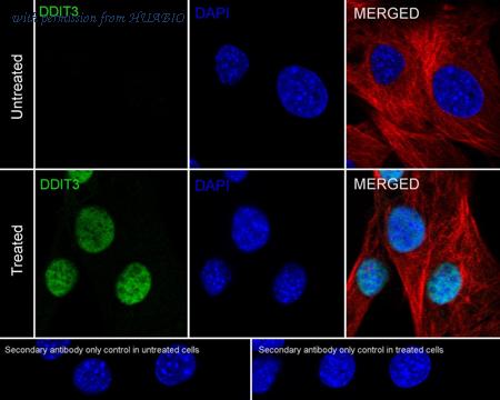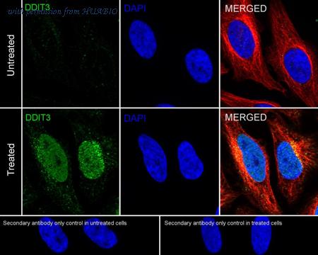 Immunocytochemistry analysis of HeLa cells treated with 2μg/mL tunicamycin for 8 hours labeling DDIT3 with Rabbit anti-DDIT3 antibody (HA751178) at 1/100 dilution. Cells were fixed in 4% paraformaldehyde for 20 minutes at room temperature, permeabilized with 0.1% Triton X-100 in PBS for 5 minutes at room temperature, then blocked with 1% BSA in 10% negative goat serum for 1 hour at room temperature. Cells were then incubated with Rabbit anti-DDIT3 antibody (HA751178) at 1/100 dilution in 1% BSA in PBST overnight at 4 ℃. Goat Anti-Rabbit IgG H&L (iFluor™ 488, HA1121) was used as the secondary antibody at 1/1,000 dilution. PBS instead of the primary antibody was used as the secondary antibody only control. Nuclear DNA was labelled in blue with DAPI. Beta tubulin (M1305-2, red) was stained at 1/100 dilution overnight at +4℃. Goat Anti-Mouse IgG H&L (iFluor™ 594, HA1126) was used as the secondary antibody at 1/1,000 dilution.