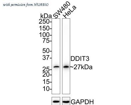 Western blot analysis of DDIT3 on different lysates with Rabbit anti-DDIT3 antibody (ET1703-05) at 1/5,000 dilution. Lane 1: SW480 cell lysate (20 µg/Lane) Lane 2: HeLa cell lysate (20 µg/Lane) Predicted band size: 19 kDa Observed band size: 27 kDa Exposure time: 3 minutes; 4-20% SDS-PAGE gel. Proteins were transferred to a PVDF membrane and blocked with 5% NFDM/TBST for 1 hour at room temperature. The primary antibody (ET1703-05) at 1/5,000 dilution was used in 5% NFDM/TBST at 4℃ overnight. Goat Anti-Rabbit IgG - HRP Secondary Antibody (HA1001) at 1/50,000 dilution was used for 1 hour at room temperature.