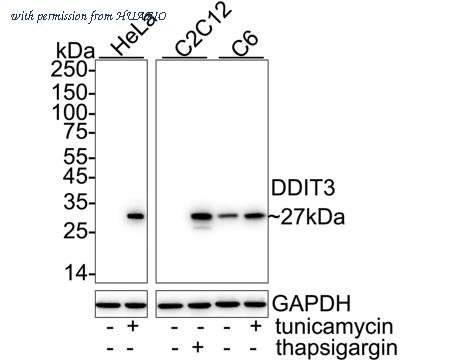 Western blot analysis of DDIT3 on different lysates with Rabbit anti-DDIT3 antibody (HA751178) at 1/5,000 dilution. Lane 1: HeLa cell lysate Lane 2: HeLa treated with 2μg/mL tunicamycin for 8 hours cell lysate Lane 3: C2C12 cell lysate Lane 4: C2C12 treated with 2μg/mL thapsigargin for 8 hours cell lysate Lane 5: C6 cell lysate Lane 6: C6 treated with 2μg/mL tunicamycin for 8 hours cell lysate Lysates/proteins at 20 µg/Lane. Predicted band size: 19 kDa Observed band size: 27 kDa Exposure time: Lane 1-2: 3 minutes; Lane 3-6: 10 seconds; ECL: K1801; 4-20% SDS-PAGE gel. Proteins were transferred to a PVDF membrane and blocked with 5% NFDM/TBST for 1 hour at room temperature. The primary antibody (HA751178) at 1/5,000 dilution was used in 5% NFDM/TBST at 4℃ overnight. Goat Anti-Rabbit IgG - HRP Secondary Antibody (HA1001) at 1/50,000 dilution was used for 1 hour at room temperature.