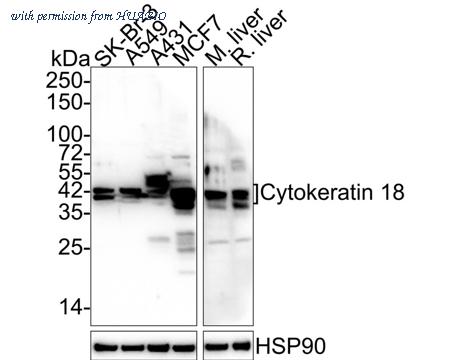 Western blot analysis of Cytokeratin 18 on different lysates with Mouse anti-Cytokeratin 18 antibody (HA601260) at 1/1,000 dilution. Lane 1: SK-Br-3 cell lysate (20 µg/Lane) Lane 2: A549 cell lysate (20 µg/Lane) Lane 3: A431 cell lysate (20 µg/Lane) Lane 4: MCF7 cell lysate (20 µg/Lane) Lane 5: Mouse liver tissue lysate (40 µg/Lane) Lane 6: Rat liver tissue lysate (40 µg/Lane) Predicted band size: 48 kDa Observed band size: 40-50 kDa Exposure time: Lane 1-4: 11 seconds; Lane 5-6: 2 minutes 24 seconds; 4-20% SDS-PAGE gel. Proteins were transferred to a PVDF membrane and blocked with 5% NFDM/TBST for 1 hour at room temperature. The primary antibody (HA601260) at 1/1,000 dilution was used in 5% NFDM/TBST at 4℃ overnight. Goat Anti-Mouse IgG - HRP Secondary Antibody (HA1006) at 1/50,000 dilution was used for 1 hour at room temperature.