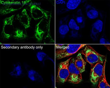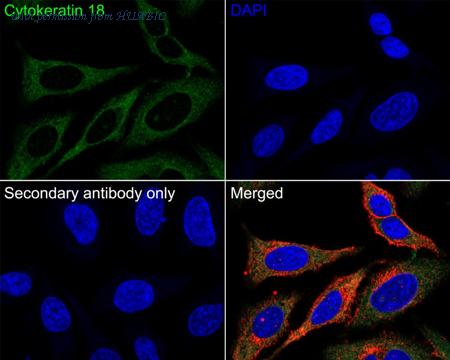 Immunocytochemistry analysis of HeLa cells labeling Cytokeratin 18 with Mouse anti-Cytokeratin 18 antibody (HA600021) at 1/100 dilution. Cells were fixed in 100% precooled methanol for 5 minutes at room temperature, then blocked with 1% BSA in 10% negative goat serum for 1 hour at room temperature. Cells were then incubated with Mouse anti-Cytokeratin 18 antibody (HA600021) at 1/100 dilution in 1% BSA in PBST overnight at 4 ℃. Goat Anti-Mouse IgG H&L (iFluor™ 488, HA1125) was used as the secondary antibody at 1/1,000 dilution. PBS instead of the primary antibody was used as the secondary antibody only control. Nuclear DNA was labelled in blue with DAPI. beta Tubulin (ET1602-4, red) was stained at 1/100 dilution overnight at +4℃. Goat Anti-Rabbit IgG H&L (iFluor™ 594, HA1122) were used as the secondary antibody at 1/1,000 dilution.