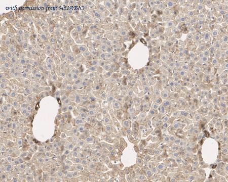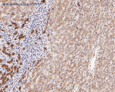 Immunohistochemical analysis of paraffin-embedded human liver tissue with Mouse anti-Cytokeratin 18 antibody (HA610135) at 1/2,000 dilution. The section was pre-treated using heat mediated antigen retrieval with Tris-EDTA buffer (pH 9.0) for 20 minutes. The tissues were blocked in 1% BSA for 20 minutes at room temperature, washed with ddH2O and PBS, and then probed with the primary antibody (HA610135) at 1/2,000 dilution for 1 hour at room temperature. The detection was performed using an HRP conjugated compact polymer system. DAB was used as the chromogen. Tissues were counterstained with hematoxylin and mounted with DPX.