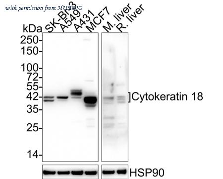 Western blot analysis of Cytokeratin 18 on different lysates with Mouse anti-Cytokeratin 18 antibody (HA600021) at 1/1,000 dilution. Lane 1: SK-Br-3 cell lysate (20 µg/Lane) Lane 2: A549 cell lysate (20 µg/Lane) Lane 3: A431 cell lysate (20 µg/Lane) Lane 4: MCF7 cell lysate (20 µg/Lane) Lane 5: Mouse liver tissue lysate (40 µg/Lane) Lane 6: Rat liver tissue lysate (40 µg/Lane) Predicted band size: 48 kDa Observed band size: 40-50 kDa Exposure time: Lane 1-4: 11 seconds; Lane 5-6: 2 minutes 24 seconds; 4-20% SDS-PAGE gel. Proteins were transferred to a PVDF membrane and blocked with 5% NFDM/TBST for 1 hour at room temperature. The primary antibody (HA600021) at 1/1,000 dilution was used in 5% NFDM/TBST at 4℃ overnight. Goat Anti-Mouse IgG - HRP Secondary Antibody (HA1006) at 1/50,000 dilution was used for 1 hour at room temperature.