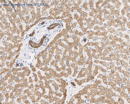 Immunohistochemical analysis of paraffin-embedded mouse liver tissue with Mouse anti-Cytokeratin 18 antibody (HA610135) at 1/2,000 dilution. The section was pre-treated using heat mediated antigen retrieval with Tris-EDTA buffer (pH 9.0) for 20 minutes. The tissues were blocked in 1% BSA for 20 minutes at room temperature, washed with ddH2O and PBS, and then probed with the primary antibody (HA610135) at 1/2,000 dilution for 1 hour at room temperature. The detection was performed using an HRP conjugated compact polymer system. DAB was used as the chromogen. Tissues were counterstained with hematoxylin and mounted with DPX.