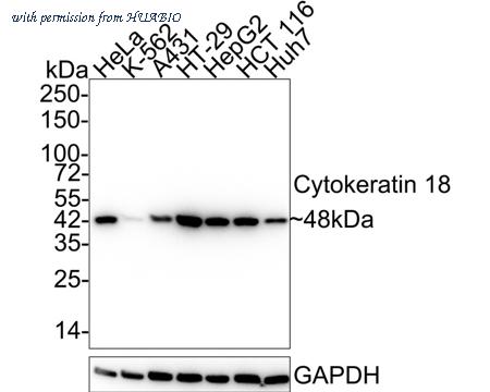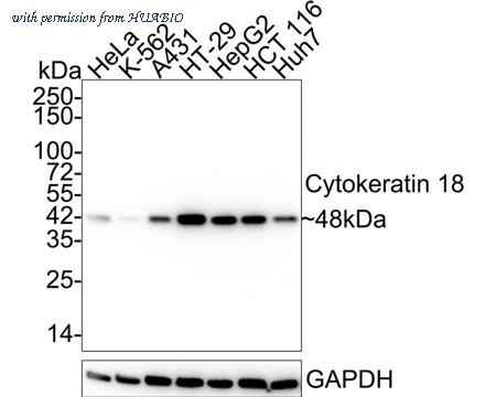 Western blot analysis of Cytokeratin 18 on different lysates with Mouse anti-Cytokeratin 18 antibody (HA601269) at 1/2,000 dilution. Lane 1: HeLa cell lysate Lane 2: K-562 cell lysate Lane 3: A431 cell lysate Lane 4: HT-29 cell lysate Lane 5: HepG2 cell lysate Lane 6: HCT 116 cell lysate Lane 7: Huh7 cell lysate Lysates/proteins at 20 µg/Lane. Predicted band size: 48 kDa Observed band size: 48 kDa Exposure time: 5 seconds; 4-20% SDS-PAGE gel. Proteins were transferred to a PVDF membrane and blocked with 5% NFDM/TBST for 1 hour at room temperature. The primary antibody (HA601269) at 1/2,000 dilution was used in 5% NFDM/TBST at 4℃ overnight. Goat Anti-Mouse IgG - HRP Secondary Antibody (HA1006) at 1/50,000 dilution was used for 1 hour at room temperature.