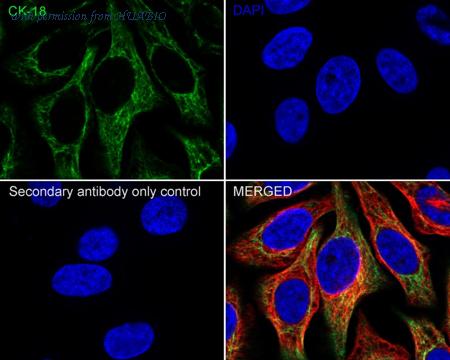 Immunocytochemistry analysis of HeLa cells labeling Cytokeratin 18 with Mouse anti-Cytokeratin 18 antibody (HA601269) at 1/100 dilution. Cells were fixed in 4% paraformaldehyde for 20 minutes at room temperature, permeabilized with 0.1% Triton X-100 in PBS for 5 minutes at room temperature, then blocked with 1% BSA in 10% negative goat serum for 1 hour at room temperature. Cells were then incubated with Mouse anti-Cytokeratin 18 antibody (HA601269) at 1/100 dilution in 1% BSA in PBST overnight at 4 ℃. Goat Anti-Mouse IgG H&L (iFluor™ 488, HA1125) was used as the secondary antibody at 1/1,000 dilution. PBS instead of the primary antibody was used as the secondary antibody only control. Nuclear DNA was labelled in blue with DAPI. beta Tubulin (ET1602-4, red) was stained at 1/100 dilution overnight at +4℃. Goat Anti-Rabbit IgG H&L (iFluor™ 594, HA1122) were used as the secondary antibody at 1/1,000 dilution.
