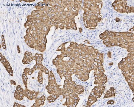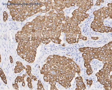 Immunohistochemical analysis of paraffin-embedded human breast cancer tissue with Mouse anti-Cytokeratin 18 antibody (HA610144) at 1/2,000 dilution. The section was pre-treated using heat mediated antigen retrieval with Tris-EDTA buffer (pH 9.0) for 20 minutes. The tissues were blocked in 1% BSA for 20 minutes at room temperature, washed with ddH2O and PBS, and then probed with the primary antibody (HA610144) at 1/2,000 dilution for 1 hour at room temperature. The detection was performed using an HRP conjugated compact polymer system. DAB was used as the chromogen. Tissues were counterstained with hematoxylin and mounted with DPX.