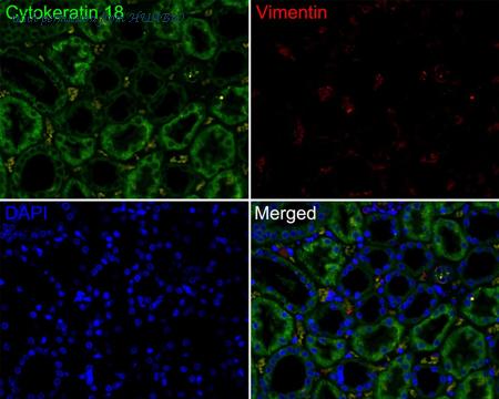 Immunofluorescence analysis of paraffin-embedded human kidney tissue labeling Cytokeratin 18 (HA720139F) and Vimentin (EM0401). The section was pre-treated using heat mediated antigen retrieval with Tris-EDTA buffer (pH 9.0) for 20 minutes. The tissues were blocked in 10% negative goat serum for 1 hour at room temperature, washed with PBS. And then probed with the primary antibodies Cytokeratin 18 (HA720139F, green) at 1/50 dilution and Vimentin (EM0401, red) at 1/1,000 dilution overnight at 4 ℃, washed with PBS. iFluor™ 594 conjugate-Goat anti-Mouse IgG (HA1126) was used as the secondary antibody at 1/1,000 dilution. DAPI was used as nuclear counterstain.