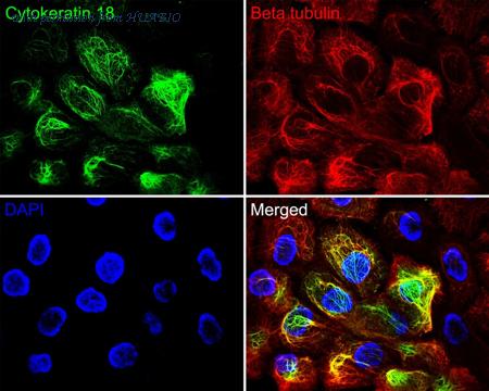 Immunocytochemistry analysis of SK-Br-3 cells labeling Cytokeratin 18 with Rabbit anti-Cytokeratin 18 antibody (HA720139F) at 1/100 dilution. Cells were fixed in 4% paraformaldehyde for 15 minutes, permeabilized with 0.1% Triton X-100 in PBS for 15 minutes, and then blocked with 1% BSA for 30 minutes at room temperature. Cells were then incubated with Rabbit anti-Cytokeratin 18 antibody (HA720139F) at 1/100 dilution in 1% BSA overnight at 4 ℃. Nuclear DNA was labelled in blue with DAPI. Beta tubulin (M1305-2, red) was stained at 1/200 dilution overnight at +4℃. Goat Anti-Mouse IgG H&L (iFluor™ 594, HA1126) were used as the secondary antibody at 1/800 dilution.