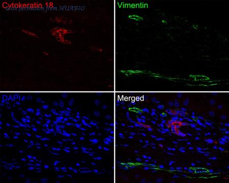 Immunofluorescence analysis of paraffin-embedded human liver tissue labeling Cytokeratin 18 (HA720151F) and Vimentin (EM0401). The section was pre-treated using heat mediated antigen retrieval with Tris-EDTA buffer (pH 9.0) for 20 minutes. The tissues were blocked in 10% negative goat serum for 1 hour at room temperature, washed with PBS. And then probed with the primary antibodies Cytokeratin 18 (HA720151F, red) at 1/50 dilution and Vimentin (EM0401, green) at 1/1,000 dilution overnight at 4 ℃, washed with PBS. iFluor™ 488 conjugate-Goat anti-Mouse IgG (HA1125) was used as the secondary antibody at 1/1,000 dilution. DAPI was used as nuclear counterstain.