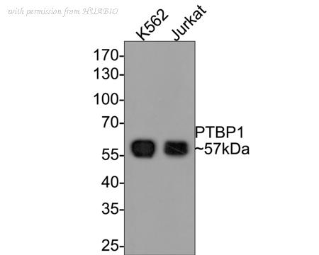 Western blot analysis of PTBP1 on different lysates with Rabbit anti-PTBP1 antibody (ET7106-58) at 1/500 dilution. Lane 1: K562 cell lysate Lane 2: Jurkat cell lysate Lysates/proteins at 10 µg/Lane. Predicted band size: 57 kDa Observed band size: 57 kDa Exposure time: 1 minute; 10% SDS-PAGE gel. Proteins were transferred to a PVDF membrane and blocked with 5% NFDM/TBST for 1 hour at room temperature. The primary antibody (ET7106-58) at 1/500 dilution was used in 5% NFDM/TBST at room temperature for 2 hours. Goat Anti-Rabbit IgG - HRP Secondary Antibody (HA1001) at 1:200,000 dilution was used for 1 hour at room temperature.