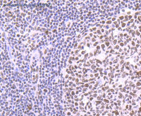 Immunohistochemical analysis of paraffin-embedded human tonsil tissue using anti-PTBP1 antibody. The section was pre-treated using heat mediated antigen retrieval with Tris-EDTA buffer (pH 9.0) for 20 minutes.The tissues were blocked in 1% BSA for 30 minutes at room temperature, washed with ddH2O and PBS, and then probed with the primary antibody (ET7106-58, 1/50) for 30 minutes at room temperature. The detection was performed using an HRP conjugated compact polymer system. DAB was used as the chromogen. Tissues were counterstained with hematoxylin and mounted with DPX.