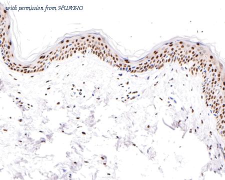 Immunohistochemical analysis of paraffin-embedded human skin tissue with Rabbit anti-PTBP1 antibody (ET7106-58) at 1/400 dilution. The section was pre-treated using heat mediated antigen retrieval with sodium citrate buffer (pH 6.0) (high pressure) for 2 minutes. The tissues were blocked in 1% BSA for 20 minutes at room temperature, washed with ddH2O and PBS, and then probed with the primary antibody (ET7106-58) at 1/400 dilution for 1 hour at room temperature. The detection was performed using an HRP conjugated compact polymer system. DAB was used as the chromogen. Tissues were counterstained with hematoxylin and mounted with DPX.