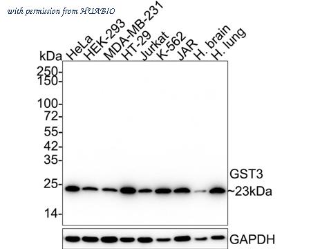 Western blot analysis of GST3 on different lysates with Mouse anti-GST3 antibody (HA610147) at 1/2,000 dilution. Lane 1: HeLa cell lysate Lane 2: HEK-293 cell lysate Lane 3: MDA-MB-231 cell lysate Lane 4: HT-29 cell lysate Lane 5: Jurkat cell lysate Lane 6: K-562 cell lysate Lane 7: JAR cell lysate Lane 8: Human brain tissue lysate Lane 9: Human lung tissue lysate Lysates/proteins at 20 µg/Lane. Predicted band size: 23 kDa Observed band size: 23 kDa Exposure time: 1 minute 2 seconds; 4-20% SDS-PAGE gel. Proteins were transferred to a PVDF membrane and blocked with 5% NFDM/TBST for 1 hour at room temperature. The primary antibody (HA610147) at 1/2,000 dilution was used in 5% NFDM/TBST at 4℃ overnight. Anti-Mouse IgG for IP Nano-secondary antibody (NBI02H) at 1/5,000 dilution was used for 1 hour at room temperature.