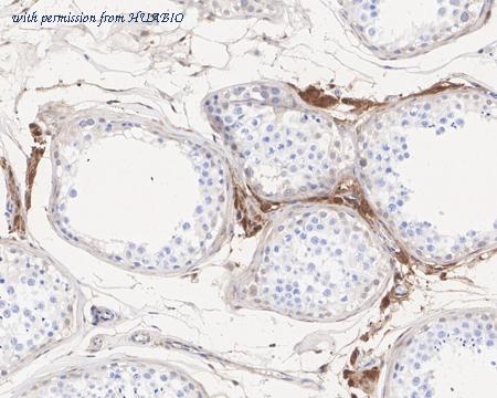 Immunohistochemical analysis of paraffin-embedded human testis tissue with Mouse anti-GST3 antibody (HA610147) at 1/5,000 dilution. The section was pre-treated using heat mediated antigen retrieval with Tris-EDTA buffer (pH 9.0) for 20 minutes. The tissues were blocked in 1% BSA for 20 minutes at room temperature, washed with ddH2O and PBS, and then probed with the primary antibody (HA610147) at 1/5,000 dilution for 1 hour at room temperature. The detection was performed using an HRP conjugated compact polymer system. DAB was used as the chromogen. Tissues were counterstained with hematoxylin and mounted with DPX.