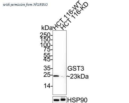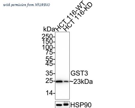 Western blot analysis of GST3 on different lysates with Rabbit anti-GST3 antibody (ET7107-71) at 1/1,000 dilution. Lane 1: HCT 116-si NT cell lysate Lane 2: HCT 116-si GST3 cell lysate Lysates/proteins at 10 µg/Lane. Predicted band size: 23 kDa Observed band size: 23 kDa Exposure time: 8 seconds; ECL: K1801; 4-20% SDS-PAGE gel. Proteins were transferred to a PVDF membrane and blocked with 5% NFDM/TBST for 1 hour at room temperature. The primary antibody (ET7107-71) at 1/1,000 dilution was used in 5% NFDM/TBST at 4℃ overnight. Goat Anti-Rabbit IgG - HRP Secondary Antibody (HA1001) at 1/50,000 dilution was used for 1 hour at room temperature.