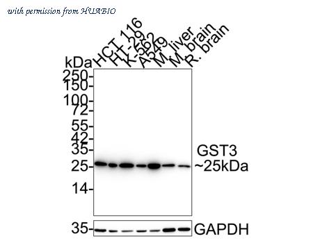 Western blot analysis of GST3 on different lysates with Rabbit anti-GST3 antibody (ET7107-71) at 1/1,000 dilution. Lane 1: HCT 116 cell lysate Lane 1: HT-29 cell lysate Lane 1: K-562 cell lysate Lane 1: A549 cell lysate Lane 2: Mouse liver tissue lysate Lane 2: Mouse brain tissue lysate Lane 2: Rat brain tissue lysate Lysates/proteins at 20 µg/Lane1-4 and 40ug/Lane5-7. Predicted band size: 23 kDa Observed band size: 25 kDa Exposure time: 8 seconds; ECL: K1801; 4-20% SDS-PAGE gel. Proteins were transferred to a PVDF membrane and blocked with 5% NFDM/TBST for 1 hour at room temperature. The primary antibody (ET7107-71) at 1/1,000 dilution was used in 5% NFDM/TBST at 4℃ overnight. Goat Anti-Rabbit IgG - HRP Secondary Antibody (HA1001) at 1/50,000 dilution was used for 1 hour at room temperature.