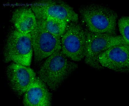ICC staining GST3 in A549 cells (green). The nuclear counter stain is DAPI (blue). Cells were fixed in paraformaldehyde, permeabilised with 0.25% Triton X100/PBS.