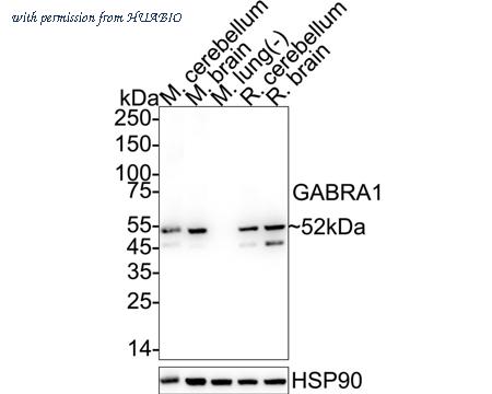 Western blot analysis of GABRA1 on different lysates with Mouse anti-GABRA1 antibody (HA601383) at 1/2,000 dilution. Lane 1: Mouse cerebellum tissue lysate Lane 2: Mouse brain tissue lysate Lane 3: Mouse lung tissue lysate (negative) Lane 4: Rat cerebellum tissue lysate Lane 5: Rat brain tissue lysate Lysates/proteins at 30 µg/Lane. Predicted band size: 52 kDa Observed band size: 52 kDa Exposure time: 4 seconds; ECL: K1801; 4-20% SDS-PAGE gel. Proteins were transferred to a PVDF membrane and blocked with 5% NFDM/TBST for 1 hour at room temperature. The primary antibody (HA601383) at 1/2,000 dilution was used in 5% NFDM/TBST at 4℃ overnight. Goat Anti-Mouse IgG - HRP Secondary Antibody (HA1006) at 1/50,000 dilution was used for 1 hour at room temperature.
