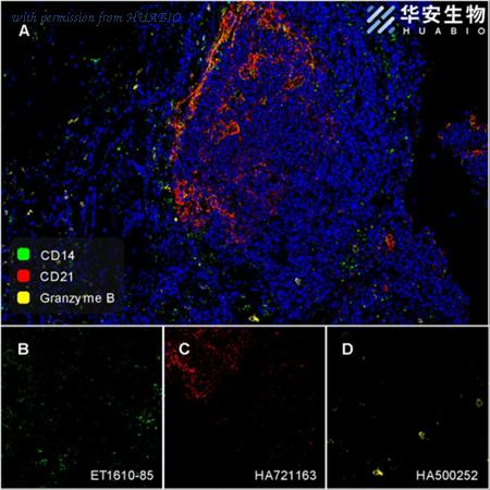 Fluorescence multiplex immunohistochemical analysis of human tonsil (Formalin/PFA-fixed paraffin-embedded sections). Panel A: the merged image of anti-CD14 (ET1610-85, Green), anti-CD21 (HA721163, Red) and anti-Granzyme B (HA500252, Yellow) on tonsil. HRP Conjugated UltraPolymer Goat Polyclonal Antibody HA1119/HA1120 was used as a secondary antibody. The immunostaining was performed with the Sequential Immuno-staining Kit (IRISKit™MH010101, www.luminiris.cn). The section was incubated in three rounds of staining: in the order of ET1610-85 (1/800 dilution), HA721163 (1/1,000 dilution) and HA500252 (1/200 dilution) for 20 mins at room temperature. Each round was followed by a separate fluorescent tyramide signal amplification system. Heat mediated antigen retrieval with Tris-EDTA buffer (pH 9.0) for 30 mins at 95℃. DAPI (blue) was used as a nuclear counter stain. Image acquisition was performed with Zeiss Observer 7 Inverted Fluorescence Microscope.