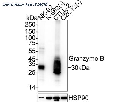 Western blot analysis of Granzyme B on different lysates with Rabbit anti-Granzyme B antibody (HA751527) at 1/100,000 dilution. Lane 1: NK-92 cell lysate (20 µg/Lane) Lane 2: K-562 cell lysate (negative) (20 µg/Lane) Lane 3: CTLL-2 cell lysate (20 µg/Lane) Lane 4: C2C12 cell lysate (negative) (20 µg/Lane) Predicted band size: 28 kDa Observed band size: 30 kDa Exposure time: 2 seconds; ECL: K1801; 4-20% SDS-PAGE gel. Proteins were transferred to a PVDF membrane and blocked with 5% NFDM/TBST for 1 hour at room temperature. The primary antibody (HA751527) at 1/100,000 dilution was used in primary antibody dilution (K1803) at 4℃ overnight. Goat Anti-Rabbit IgG - HRP Secondary Antibody (HA1001) at 1/50,000 dilution was used for 1 hour at room temperature.