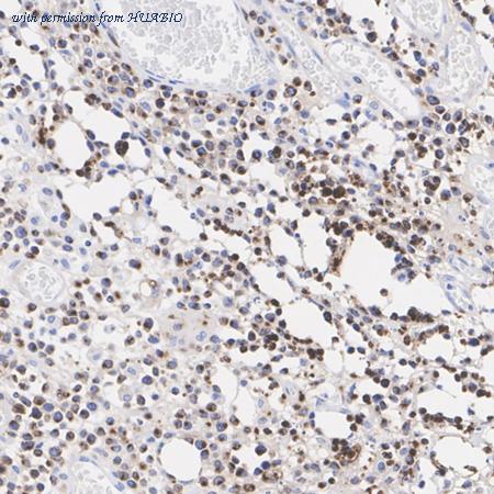 Immunohistochemical analysis of paraffin-embedded human spleen tissue using anti-Granzyme B antibody. The section was pre-treated using heat mediated antigen retrieval with Tris-EDTA buffer (pH 8.0-8.4) for 20 minutes.The tissues were blocked in 5% BSA for 30 minutes at room temperature, washed with ddH2O and PBS, and then probed with the primary antibody (HA500252, 1/400) for 30 minutes at room temperature. The detection was performed using an HRP conjugated compact polymer system. DAB was used as the chromogen. Tissues were counterstained with hematoxylin and mounted with DPX.