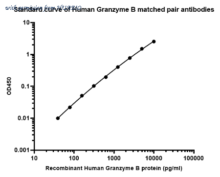 Sandwich ELISA analysis of Human Granzyme B matched pair antibodies Capture: HA723803, Human Granzyme B Rabbit mAb [PSH15-98] Detector: HA723804, Human Granzyme B Rabbit mAb [PSH15-99] Elisa assay was performed by coating wells of a 96-well plate with 50 µl per well of capture antibody (HA723803) diluted in carbonate/bicarbonate buffer, at a concentration of 5 µg/ml overnight at 4℃. Wells of the plate were washed, blocked with 150 µl 0.05% tween-20 1% BSA blocking buffer, and incubated with serial diluted Recombinant Human Granzyme B protein (HA211076) protein starting from 10,000 pg/ml to 0 pg/ml and detect antibody (HA723804, Biotin, 0.2 µg/ml) for 1 hour at 30℃ with shaking. Then the plate was washed and incubated with 50 µl per well of SA-HRP for 0.5 hour at 30℃ with shaking. Detection was performed using an Ultra TMB Substrate for 10 minutes at room temperature in the dark. The reaction was stopped with sulfuric acid and absorbances were read on a spectrophotometer at 450 nm.