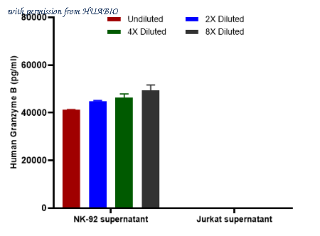 Interpolated concentrations of native Granzyme B in NK-92 and Jurkat cell culture supernatant. Capture: HA723803, Human Granzyme B Rabbit mAb [PSH15-98] Detector: HA723804, Human Granzyme B Rabbit mAb [PSH15-99] The concentrations of Granzyme B were measured in duplicates, interpolated from the Granzyme B standard curve and corrected for sample dilution. Undiluted samples are NK-92 cell culture supernatant 10% and Jurkat cell culture supernatant 50%. The interpolated dilution factor corrected values are plotted (mean +/- SD, n=2). The mean Granzyme B concentration was determined to be 45,446 pg/ml in NK-92 cell culture supernatant and undetectable in Jurkat cell culture supernatant.