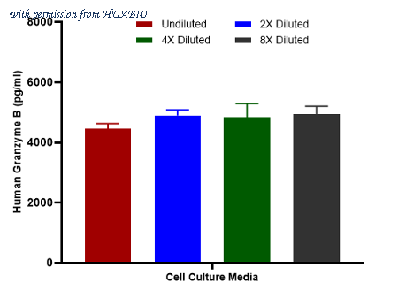 Interpolated concentrations of spiked Granzyme B in human cell culture media samples. Capture: HA723803, Human Granzyme B Rabbit mAb [PSH15-98] Detector: HA723804, Human Granzyme B Rabbit mAb [PSH15-99] The concentrations of Granzyme B were measured in duplicates, interpolated from the Granzyme B standard curves and corrected for sample dilution. Diluted samples are as follows: 50% cell culture media with FBS. The interpolated dilution factor corrected values are plotted (mean +/- SD, n=2).