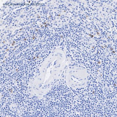 Immunohistochemical analysis of paraffin-embedded human spleen tissue with Rabbit anti-Granzyme B antibody (HA751527) at 1/500 dilution. The section was pre-treated using heat mediated antigen retrieval with Tris-EDTA buffer (pH 9.0) for 20 minutes. The tissues were blocked in 1% BSA for 20 minutes at room temperature, washed with ddH2O and PBS, and then probed with the primary antibody (HA751527) at 1/500 dilution for 1 hour at room temperature. The detection was performed using an HRP conjugated compact polymer system. DAB was used as the chromogen. Tissues were counterstained with hematoxylin and mounted with DPX.