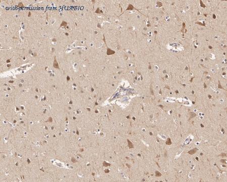 Immunohistochemical analysis of paraffin-embedded human brain tissue with Mouse anti-HSP90 Beta antibody (HA610060) at 1/5,000 dilution. The section was pre-treated using heat mediated antigen retrieval with Tris-EDTA buffer (pH 9.0) for 20 minutes. The tissues were blocked in 1% BSA for 20 minutes at room temperature, washed with ddH2O and PBS, and then probed with the primary antibody (HA610060) at 1/5,000 dilution for 1 hour at room temperature. The detection was performed using an HRP conjugated compact polymer system. DAB was used as the chromogen. Tissues were counterstained with hematoxylin and mounted with DPX.