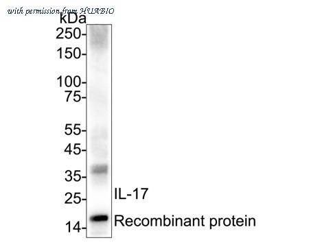 Western blot analysis of IL-17 on IL-17 recombinant protein with Rabbit anti-IL-17 antibody (ER1706-91) at 1/1,000 dilution. Lysates/proteins at 50 ng/Lane. Predicted band size: 18 kDa Observed band size: 16 kDa Exposure time: 10 seconds; ECL: K1801; 4-20% SDS-PAGE gel. Proteins were transferred to a PVDF membrane and blocked with 5% NFDM/TBST for 1 hour at room temperature. The primary antibody (ER1706-91) at 1/1,000 dilution was used in 5% NFDM/TBST at 4℃ overnight. Goat Anti-Rabbit IgG - HRP Secondary Antibody (HA1001) at 1/50,000 dilution was used for 1 hour at room temperature.