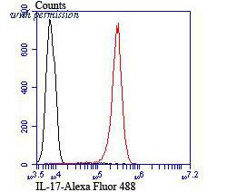 Flow cytometric analysis of Jurkat cells with IL-17 antibody at 1/100 dilution (red) compared with an unlabelled control (cells without incubation with primary antibody; black).