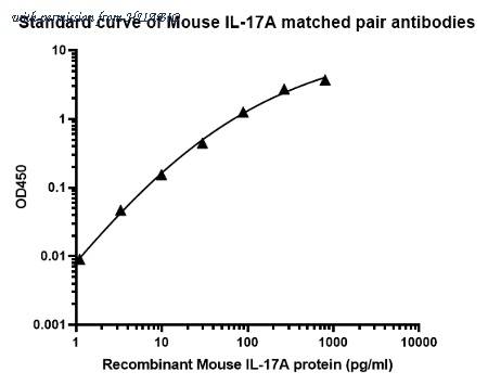Sandwich ELISA analysis of Mouse IL-17A matched pair antibodies Capture: HA722264, Mouse IL-17A Rabbit mAb [PSH05-35] Detector: HA722265, Mouse IL-17A Rabbit mAb [PSH05-36] Elisa assay was performed by coating wells of a 96-well plate with 100 µl per well of capture antibody (HA722264) diluted in carbonate/bicarbonate buffer, at a concentration of 2 µg/mL overnight at 4℃. Wells of the plate were washed, blocked with 150 µl 0.05% tween-20 1%BSA blocking buffer, and incubated with serial diluted recombinant standard Mouse IL-17A protein (HA210791) starting from 800 pg/ml to 0 pg/ml and detect antibody (HA722265, Biotin, 0.2 µg/ml) for 1 hour at 30℃ with shaking. Then the plate was washed and incubated with 100 µl per well of SA-HRP for 0.5 hour at 30℃ with shaking. Detection was performed using an Ultra TMB Substrate for 10 minutes at room temperature in the dark. The reaction was stopped with sulfuric acid and absorbances were read on a spectrophotometer at 450 nm.