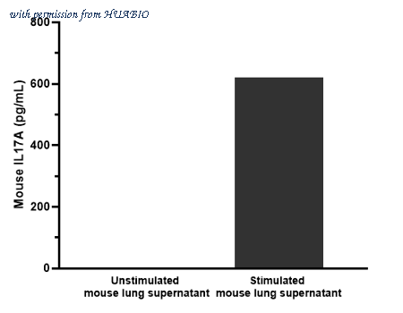Mouse lung were stimulated with 5 µg/mL LPS and incubated for 6 days. Capture: HA722264, Mouse IL-17A Rabbit mAb [PSH05-35] Detector: HA722265, Mouse IL-17A Rabbit mAb [PSH05-36] The concentrations of IL17A were interpolated from the IL17A standard curves and corrected for sample dilution.Undiluted samples are LPS stimulated mouse lung supernatants 50% and unstimulated mouse lung supernatants 50%. The mean IL17A concentration was determined to be 621 pg/mL in LPS stimulated mouse lung supernatant and undetectable in the unstimulated mouse lung supernatant.