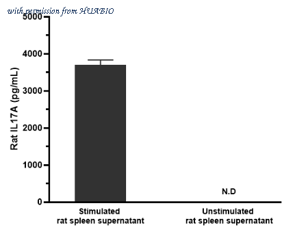 Interpolated concentrations of native IL17A in unstimulated or stimulated rat spleen culture supernatant. Capture: HA722264, Mouse IL-17A Rabbit mAb [PSH05-35] Detector: HA722265, Mouse IL-17A Rabbit mAb [PSH05-36] Rat spleen were stimulated with 5 µg/mL Concanavalin A and incubated for 2 days.The concentrations of IL17A were interpolated from the IL17A standard curves and corrected for sample dilution. Undiluted samples are Concanavalin A stimulated rat spleen supernatants 20% and unstimulated rat spleen supernatants 50%. The mean IL17A concentration was determined to be 3,703 pg/mL in Concanavalin A stimulated rat spleen supernatant and undetectable in the unstimulated rat spleen supernatant.