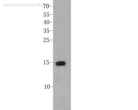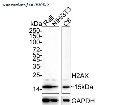 Western blot analysis of Histone H2A.X on different lysates with Rabbit anti-Histone H2A.X antibody (ET1705-97) at 1/1,000 dilution. Lane 1: Raji cell lysate Lane 2: NIH/3T3 cell lysate Lane 3: C6 cell lysate Lysates/proteins at 20 µg/Lane. Predicted band size: 15 kDa Observed band size: 15 kDa Exposure time: 3 minutes; 15% SDS-PAGE gel. Proteins were transferred to a PVDF membrane and blocked with 5% NFDM/TBST for 1 hour at room temperature. The primary antibody (ET1705-97) at 1/1,000 dilution was used in 5% NFDM/TBST at 4℃ overnight. Goat Anti-Rabbit IgG - HRP Secondary Antibody (HA1001) at 1/50,000 dilution was used for 1 hour at room temperature.