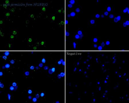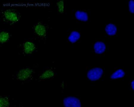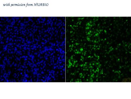 Immunofluorescence staining of paraffin- embedded human pancreas tissue using anti-Histone H2A.X antibody.The section was pre-treated using heat mediated antigen retrieval with Tris-EDTA buffer (pH 9.0) for 20 minutes. The tissues were blocked in 10% negative goat serum for 1 hour at room temperature, washed with PBS, and then probed with ET1705-97 at 1/50 dilution for 10 hours at 4℃ and detected using Alexa Fluor® 488 conjugate-Goat anti-Rabbit IgG (H+L) Secondary Antibody at a dilution of 1:500 for 1 hour at room temperature.