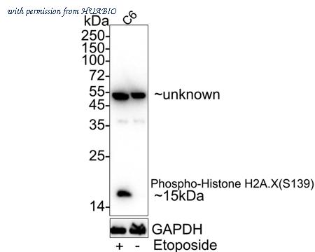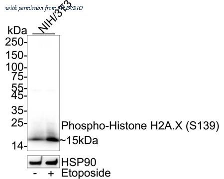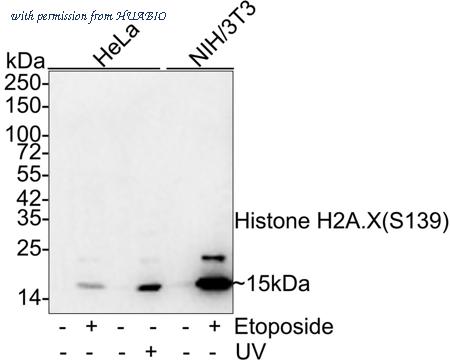 Western blot analysis of Phospho-Histone H2A.X (S139) on different lysates with Rabbit anti-Phospho-Histone H2A.X (S139) antibody (HA750034) at 1/2,000 dilution. Lane 1: HeLa whole cell lysate Lane 2: HeLa treated with 20μM Etoposide for 2 hours whole cell lysate Lane 3: HeLa whole cell lysate Lane 4: HeLa treated with UV for 2 hours whole cell lysate Lane 5: NIH/3T3 whole cell lysate Lane 6: NIH/3T3 treated with 25μM Etoposide for 5 hours whole cell lysate Lysates/proteins at 20 µg/Lane. Predicted band size: 15 kDa Observed band size: 15/20 kDa Exposure time: 53 seconds; 4-20% SDS-PAGE gel. Proteins were transferred to a PVDF membrane and blocked with 5% NFDM/TBST for 1 hour at room temperature. The primary antibody (HA750034) at 1/2,000 dilution was used in 5% NFDM/TBST at room temperature for 2 hours. Goat Anti-Rabbit IgG - HRP Secondary Antibody (HA1001) at 1/100,000 dilution was used for 1 hour at room temperature.
