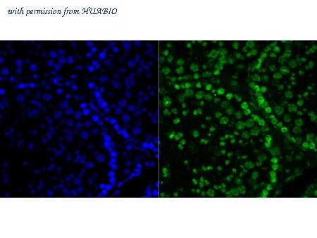 Immunofluorescence staining of paraffin- embedded mouse testis tissue using anti-Histone H2A.X antibody.The section was pre-treated using heat mediated antigen retrieval with Tris-EDTA buffer (pH 9.0) for 20 minutes. The tissues were blocked in 10% negative goat serum for 1 hour at room temperature, washed with PBS, and then probed with ET1705-97 at 1/50 dilution for 10 hours at 4℃ and detected using Alexa Fluor® 488 conjugate-Goat anti-Rabbit IgG (H+L) Secondary Antibody at a dilution of 1:500 for 1 hour at room temperature.