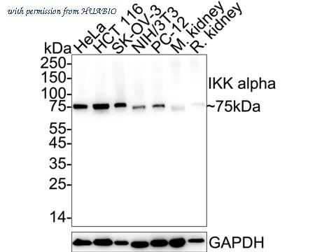 Western blot analysis of IKK alpha on different lysates with Rabbit anti-IKK alpha antibody (ER30911) at 1/2,000 dilution. Lane 1: HeLa cell lysate (20 µg/Lane) Lane 2: HCT 116 cell lysate (20 µg/Lane) Lane 3: SK-OV-3 cell lysate (20 µg/Lane) Lane 4: NIH/3T3 cell lysate (20 µg/Lane) Lane 5: PC-12 cell lysate (20 µg/Lane) Lane 6: Mouse kidney tissue lysate (40 µg/Lane) Lane 7: Rat kidney tissue lysate (40 µg/Lane) Predicted band size: 85 kDa Observed band size: 75 kDa Exposure time: 26 seconds; ECL: K1801; 4-20% SDS-PAGE gel. Proteins were transferred to a PVDF membrane and blocked with 5% NFDM/TBST for 1 hour at room temperature. The primary antibody (ER30911) at 1/2,000 dilution was used in 5% NFDM/TBST at 4℃ overnight. Goat Anti-Rabbit IgG - HRP Secondary Antibody (HA1001) at 1/50,000 dilution was used for 1 hour at room temperature.