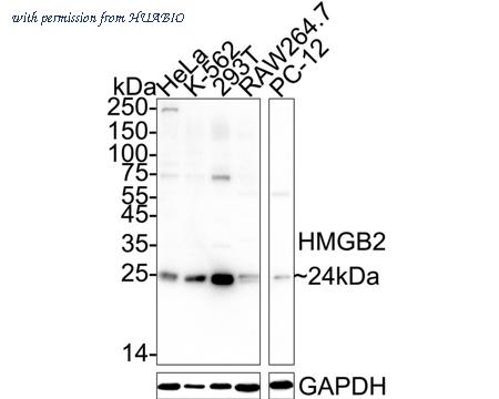Western blot analysis of HMGB2 on different lysates with Mouse anti-HMGB2 antibody (EM1902-06) at 1/1,000 dilution. Lane 1: HeLa cell lysate Lane 2: K-562 cell lysate Lane 3: 293T cell lysate Lane 4: RAW264.7 cell lysate Lane 5: PC-12 cell lysate Lysates/proteins at 20 µg/Lane. Predicted band size: 24 kDa Observed band size: 24 kDa Exposure time: 3 minutes; ECL: K1801; 4-20% SDS-PAGE gel. Proteins were transferred to a PVDF membrane and blocked with 5% NFDM/TBST for 1 hour at room temperature. The primary antibody (EM1902-06) at 1/1,000 dilution was used in 5% NFDM/TBST at 4℃ overnight. Goat Anti-Mouse IgG - HRP Secondary Antibody (HA1006) at 1/50,000 dilution was used for 1 hour at room temperature.