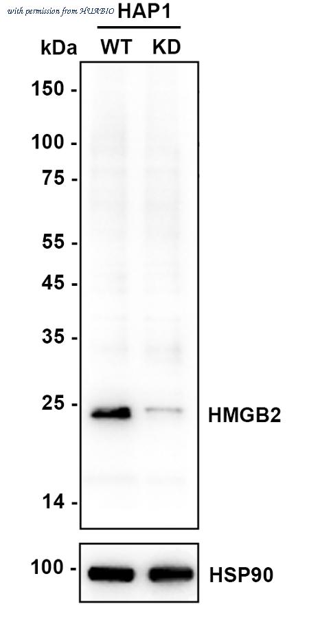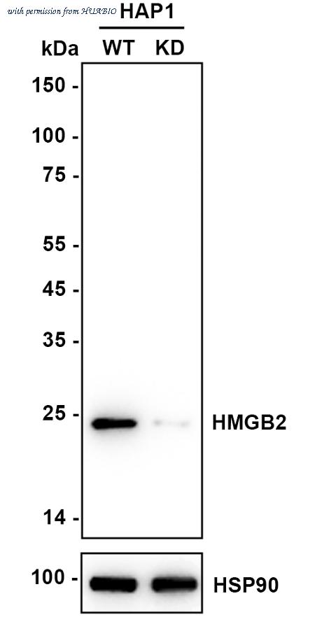 Western blot analysis of HMGB2 on different lysates with Rabbit anti-HMGB2 antibody (HA721925) at 1/2,000 dilution. Lane 1: HAP1-parental cell lysate Lane 2: HAP1-HMGB2 KD cell lysate Lysates/proteins at 10 µg/Lane. Predicted band size: 24 kDa Observed band size: 24 kDa Exposure time: 6 seconds; ECL: K1801; 4-20% SDS-PAGE gel. Proteins were transferred to a PVDF membrane and blocked with 5% NFDM/TBST for 1 hour at room temperature. The primary antibody (HA721925) at 1/2,000 dilution was used in K1803 at 4℃ overnight. Goat Anti-Rabbit IgG - HRP Secondary Antibody (HA1001) at 1/50,000 dilution was used for 1 hour at room temperature.