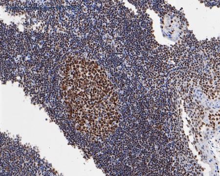 Immunohistochemical analysis of paraffin-embedded human tonsil tissue using anti-HMGB2 antibody. The section was pre-treated using heat mediated antigen retrieval with sodium citrate buffer (pH 6.0) (high pressure) for 2 minutes. The tissues were blocked in 5% BSA for 30 minutes at room temperature, washed with ddH2O and PBS, and then probed with the primary antibody (EM1902-06, 1/1,000) for 30 minutes at room temperature. The detection was performed using an HRP conjugated compact polymer system. DAB was used as the chromogen. Tissues were counterstained with hematoxylin and mounted with DPX.