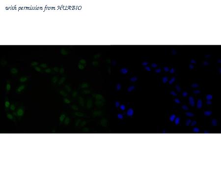 ICC staining of HMGB2 in SiHa cells (green). Formalin fixed cells were permeabilized with 0.1% Triton X-100 in TBS for 10 minutes at room temperature and blocked with 10% negative goat serum for 15 minutes at room temperature. Cells were probed with the primary antibody (HA500512, 1/50) for 1 hour at room temperature, washed with PBS. Alexa Fluor®488 Goat anti-Rabbit IgG was used as the secondary antibody at 1/1,000 dilution. The nuclear counter stain is DAPI (blue).