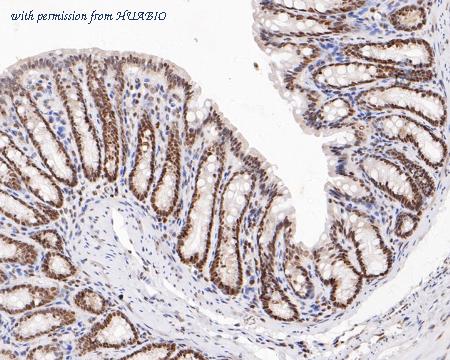Immunohistochemical analysis of paraffin-embedded rat large intestine tissue using anti-HMGB2 antibody. The section was pre-treated using heat mediated antigen retrieval with sodium citrate buffer (pH 6.0) (high pressure) for 2 minutes. The tissues were blocked in 5% BSA for 30 minutes at room temperature, washed with ddH2O and PBS, and then probed with the primary antibody (HA500512, 1/200) for 30 minutes at room temperature. The detection was performed using an HRP conjugated compact polymer system. DAB was used as the chromogen. Tissues were counterstained with hematoxylin and mounted with DPX.