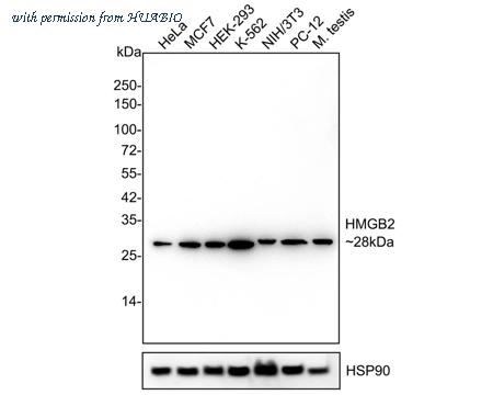 Western blot analysis of HMGB2 on different lysates with Rabbit anti-HMGB2 antibody (HA721925) at 1/1,000 dilution. Lane 1: HeLa cell lysate (20 µg/Lane) Lane 2: MCF7 cell lysate (20 µg/Lane) Lane 3: HEK-293 cell lysate (20 µg/Lane) Lane 4: K-562 cell lysate (20 µg/Lane) Lane 5: NIH/3T3 cell lysate (20 µg/Lane) Lane 6: PC-12 cell lysate (20 µg/Lane) Lane 7:Mouse testis tissue lysate (30 µg/Lane) Predicted band size: 24 kDa Observed band size: 28 kDa Exposure time: 3 minutes; ECL: K1801; 4-20% SDS-PAGE gel. Proteins were transferred to a PVDF membrane and blocked with 5% NFDM/TBST for 1 hour at room temperature. The primary antibody (HA721925) at 1/1,000 dilution was used in 5% NFDM/TBST at 4℃ overnight. Goat Anti-Rabbit IgG - HRP Secondary Antibody (HA1001) at 1/50,000 dilution was used for 1 hour at room temperature.