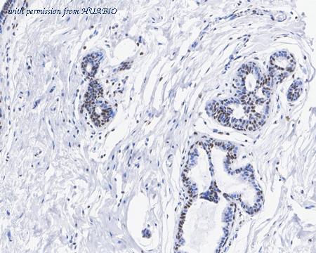 Immunohistochemical analysis of paraffin-embedded human breast carcinoma tissue with Rabbit anti-HMGB2 antibody (HA721925) at 1/500 dilution. The section was pre-treated using heat mediated antigen retrieval with sodium citrate buffer (pH 6.0) (high pressure) for 2 minutes. The tissues were blocked in 1% BSA for 20 minutes at room temperature, washed with ddH2O and PBS, and then probed with the primary antibody (HA721925) at 1/500 dilution for 1 hour at room temperature. The detection was performed using an HRP conjugated compact polymer system. DAB was used as the chromogen. Tissues were counterstained with hematoxylin and mounted with DPX.